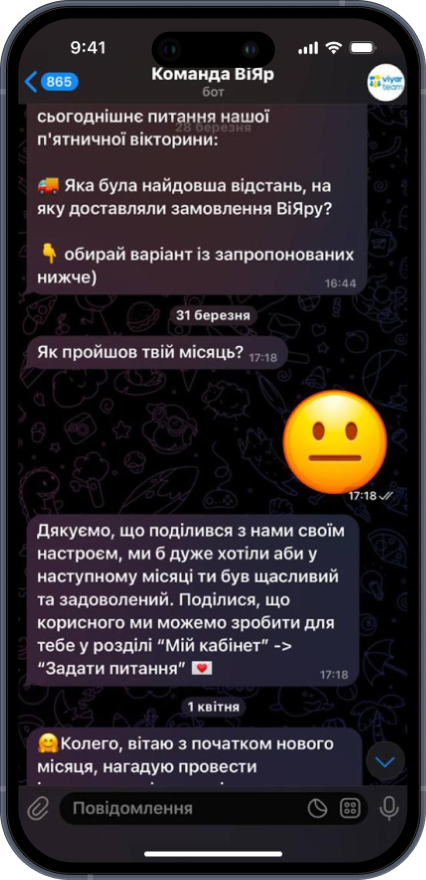 Команда BotsBand продемонструвала надзвичайну проактивність, яка допомогла їй запропонувати найкраще чат бот рішення для вирішення викликів, які мала наша компанія. Також, маючи високу компетенцію у сфері розробки чат ботів, Botsband успішно впровадити складне інноваційне Telegram рішення Webapp в рамках нашого проєкту.